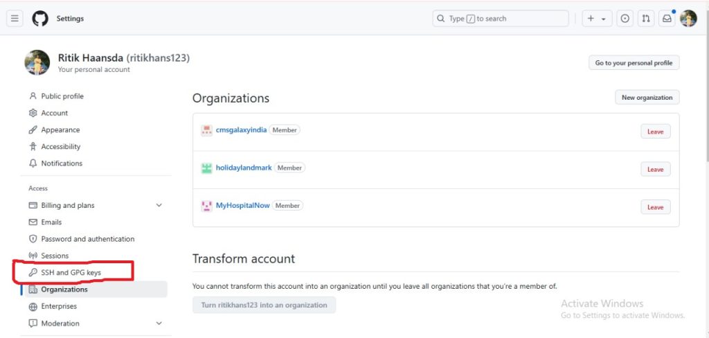 - Log in to GitHub and navigate to Settings > SSH and GPG keys.