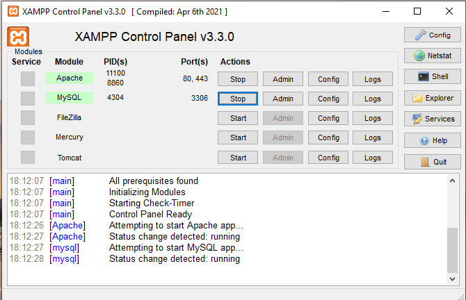 • Start the Apache and MySQL services by clicking the Start buttons next to them.